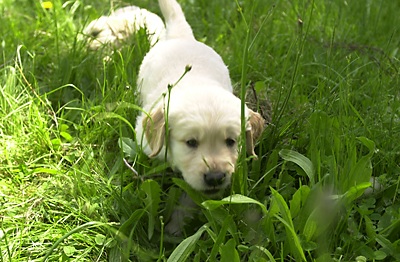 Today the puppies got to see the wide wide world of the side-yard field. So many things to see and chew!
